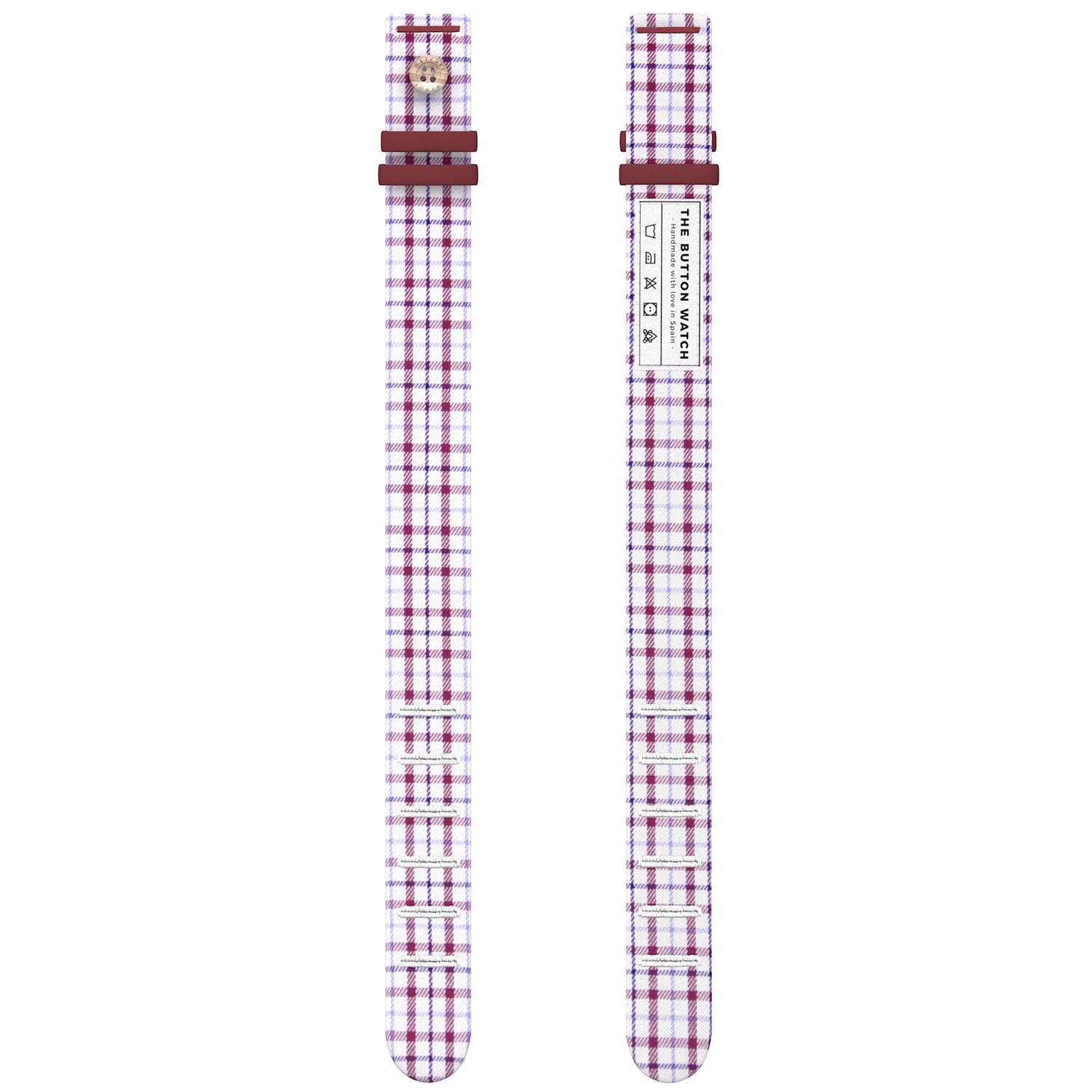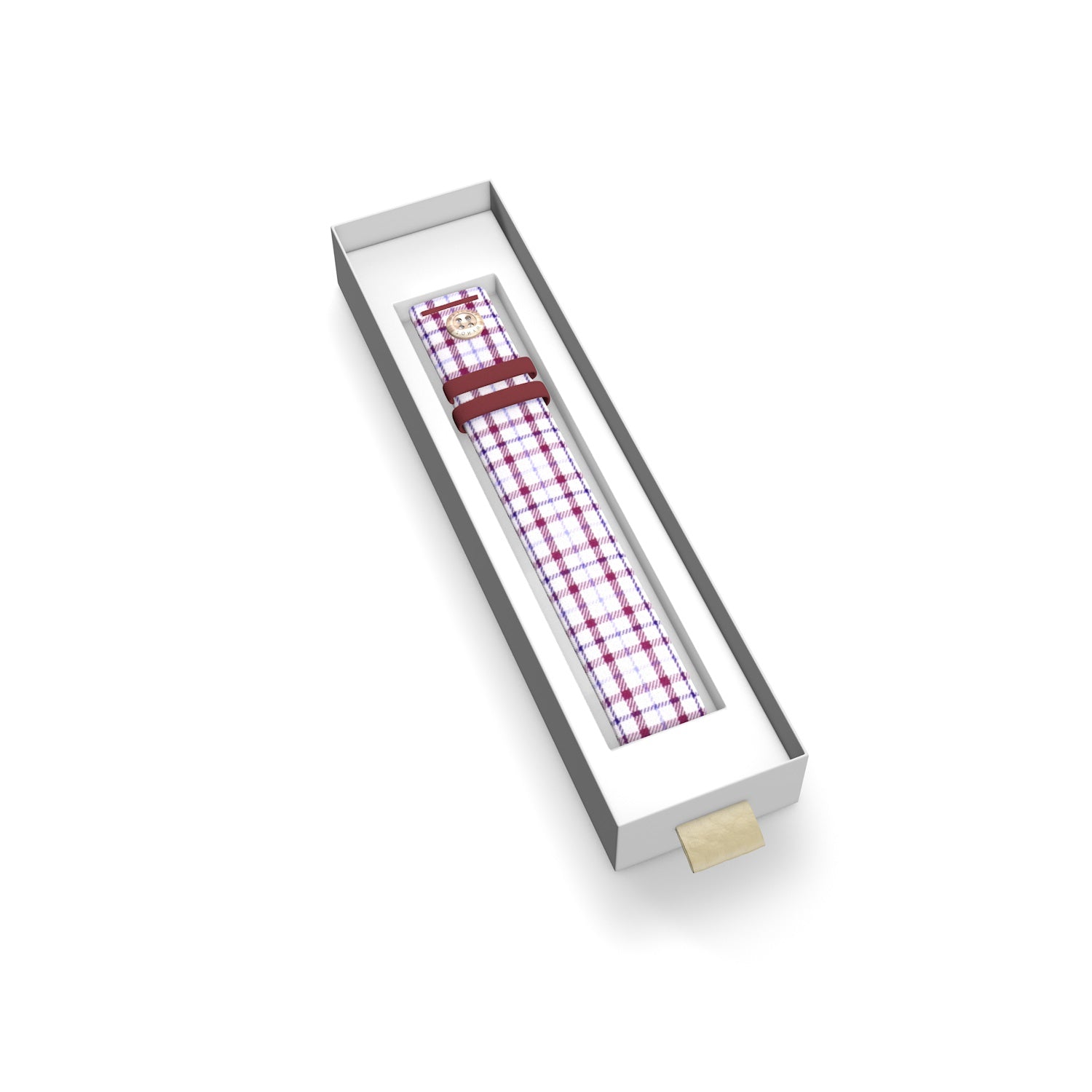 • Color de la correa: tejido de cuadros granate, blanco y azul. Pasadores granate. Ojales blancos